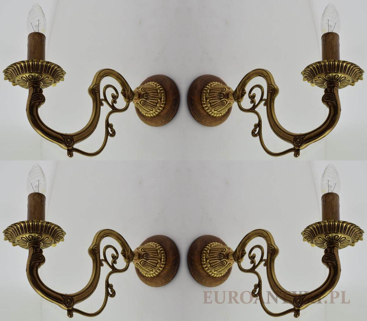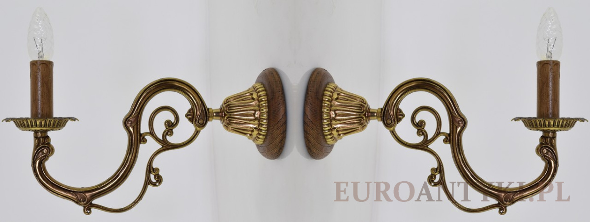 Przykład eklektyczny kinkietów mosiężnych z drugiej połowy XX wieku: