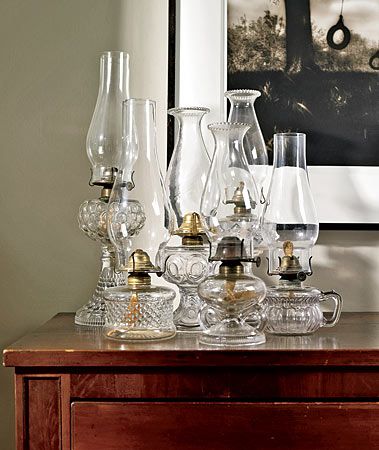 Kolekcja zabytkowych, szklanych lamp naftowych: