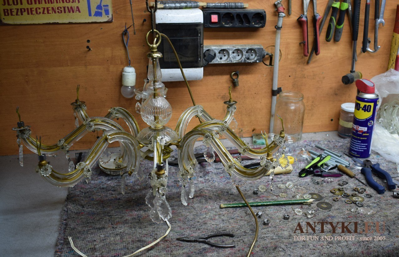 Przykładowe zdjęcie podczas prac renowacyjnych żyrandola Maria Teresa z połowy XX wieku: