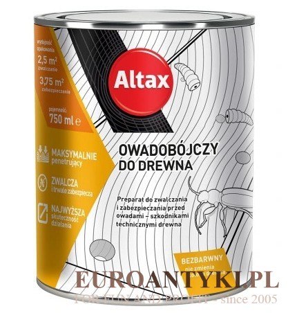 - ALTAX HYLOTOX ( POLECAM ) - Owadobójczy środek do drewna to rozpuszczalnikowy środek głęboko penetrujący, który wybija owady już żerujące w drewnie oraz trwale zabezpiecza drewno przed ich ponowną inwazją. Zaletą tego preparatu jest bardzo wysoka skuteczność. Nie zmienia koloru drewna i nie tworzy powłoki.