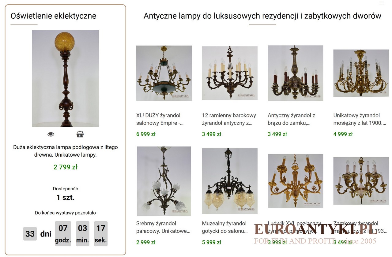 W EuroAntyki każda lampa to nie tylko przedmiot użytkowy, ale przede wszystkim kawałek historii. Od żyrandoli pałacowych, przez lampy dworskie, aż po muzealne oświetlenie, nasza kolekcja przedstawia różnorodność stylów i epok. Wybierając lampę w EuroAntyki, wybierasz fragment przeszłości, który przyniesie niepowtarzalny klimat do Twojego domu.