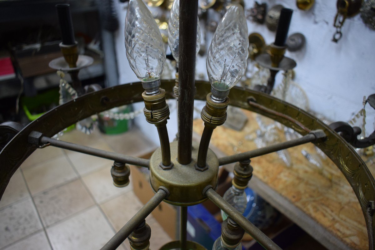 - oczyszczenie mosiężnej ramy kryształowego żyrandola z nadmiaru " znaków starości ", zostawiamy oryginalną patyne i delikatne drobne ryski bo to jest bardzo porządane wśród koneserów antyków i staroci