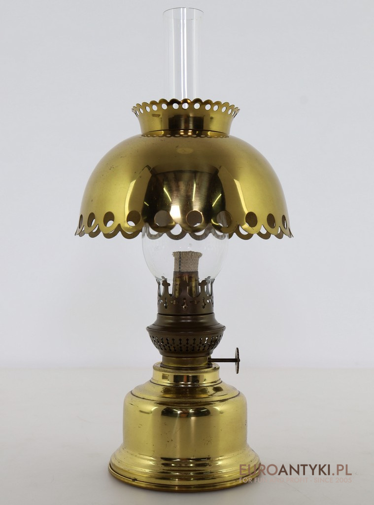 Jednym z pięknych przykładów takiego oświetlenia jest mosiężna lampa naftowa Kosmos Brenner, pochodząca z połowy XX wieku. Lampa ta, wyposażona w sprawny mechanizm poruszający knot, jest gotowa do użycia, co sprawia, że jest nie tylko dekoracją, ale również w pełni funkcjonalnym źródłem światła.